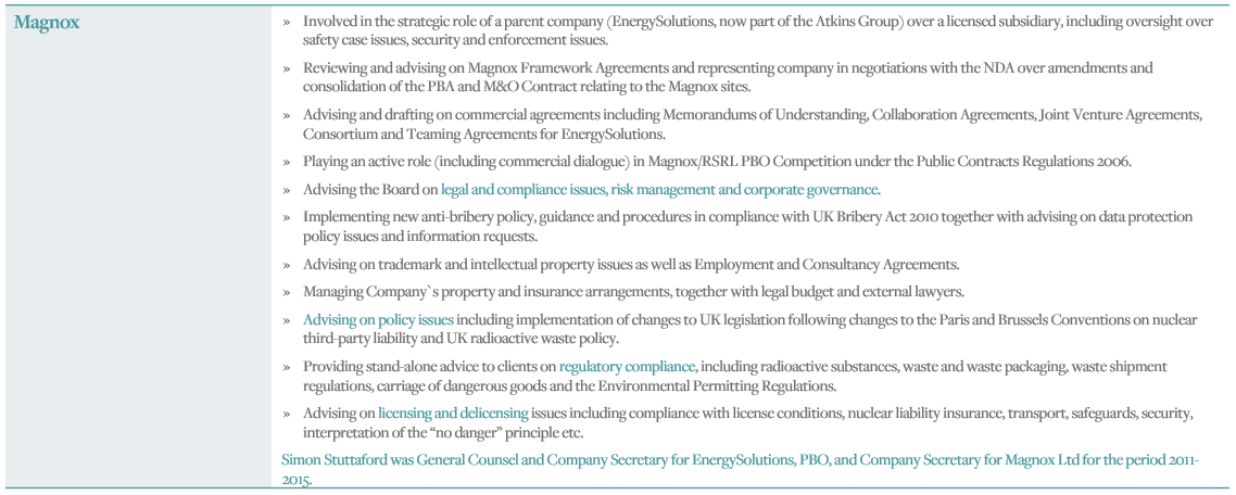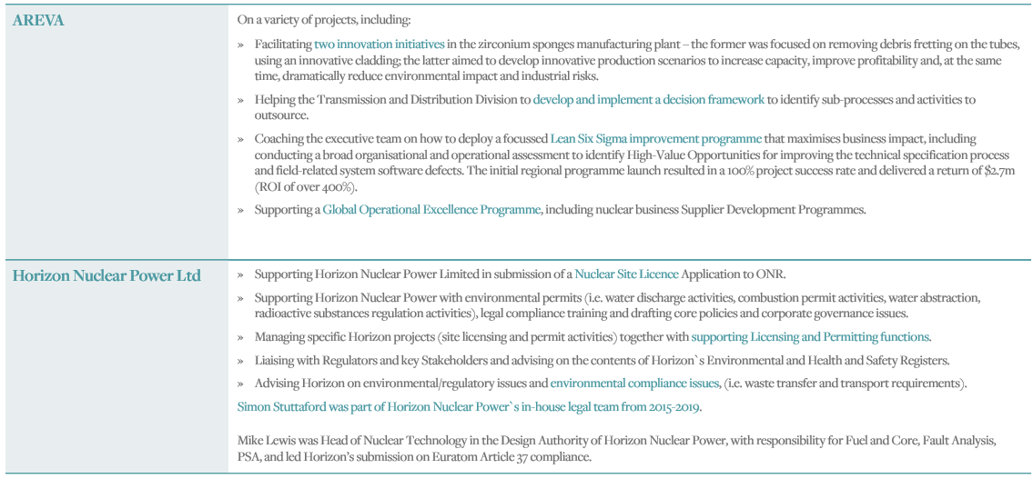 Simon leads on Nuclear and Regulatory matters covering major projects from an environmental, planning and compliance point of view. His experience includes appointments as a leading team member on legal matters for Horizon Nuclear Power and as General Counsel and Company Secretary for Energy Solutions(PBO for Magnox Ltd, SLC). Simon was a Partner with the Legal Practice DWF where he was Head of Nuclear and Joint Head of Environment. Simon has developed and delivered an online Master’s level module on Nuclear Law for the University of Birmingham. He is known for his ability to navigate complex regulatory frameworks and deliver commercially focus solutions across multiple jurisdictions. Simon’s deep sector knowledge and collaborative approach make him a trusted advisor in both nuclear and renewables projects.