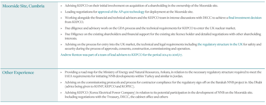 William is an independent barrister and legal consultant, expert environmental and energy lawyer, with 25years’ experience, in government, consultancy and private practice. He worked for 9 years in the UK Government Legal Service at the Department of the Environment/DETR/Defra, which included managing UK and EU legislation, advising Ministers and the Department on UK and EU radioactive substances law. For example, on Sellafield THORP, MOX and emissions decisions and cases, drafting and implementing EU legislation such as the Basic Safety Standards Directive and advising on environmental and nuclear law issues concerning the Atomic Weapons Establishments.